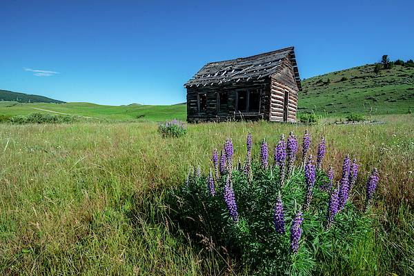 This dilapidated structure sits along Spanish Creek Road on Ted Turner's Flying D Ranch. Considering the four windows and the broad porch now collapsed in front, I think this might have been a schoolhouse at one time. Montana had plenty of rain in the July we visited and wildflowers like this clump of lupines were in abundance. I am always struck by the bright blue skies here. But this picture was taken in the morning and belied the storms that arose every afternoon that we were there.