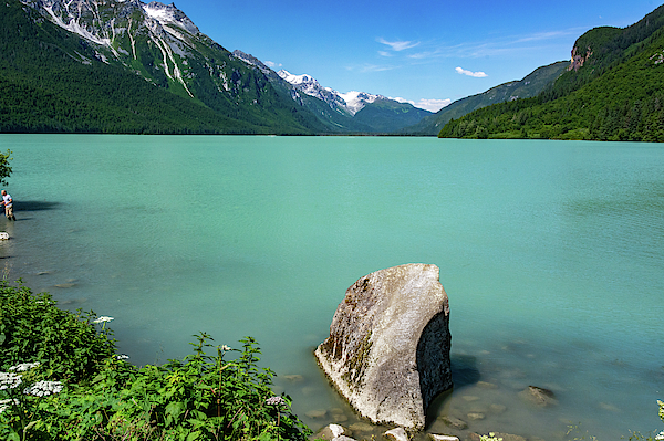 The waters of Chilkat Lake near Haines, Alaska are tinged by glacial run off to present this particular aquamarine color.... more