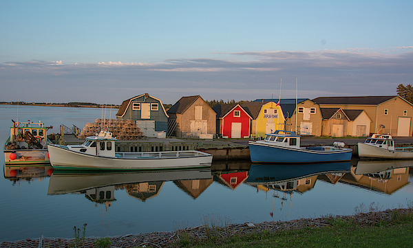 Mirror smooth waters and the setting sun cast New London Harbour in a perfect light. Prince Edward Island, Canada.