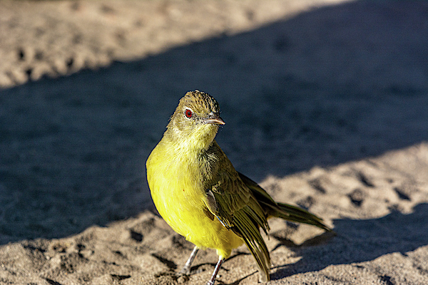 A fearless Zambezi yellow-bellied greenbul (Chlorocichla flaviventris) in Chobe National Park, Botswana.